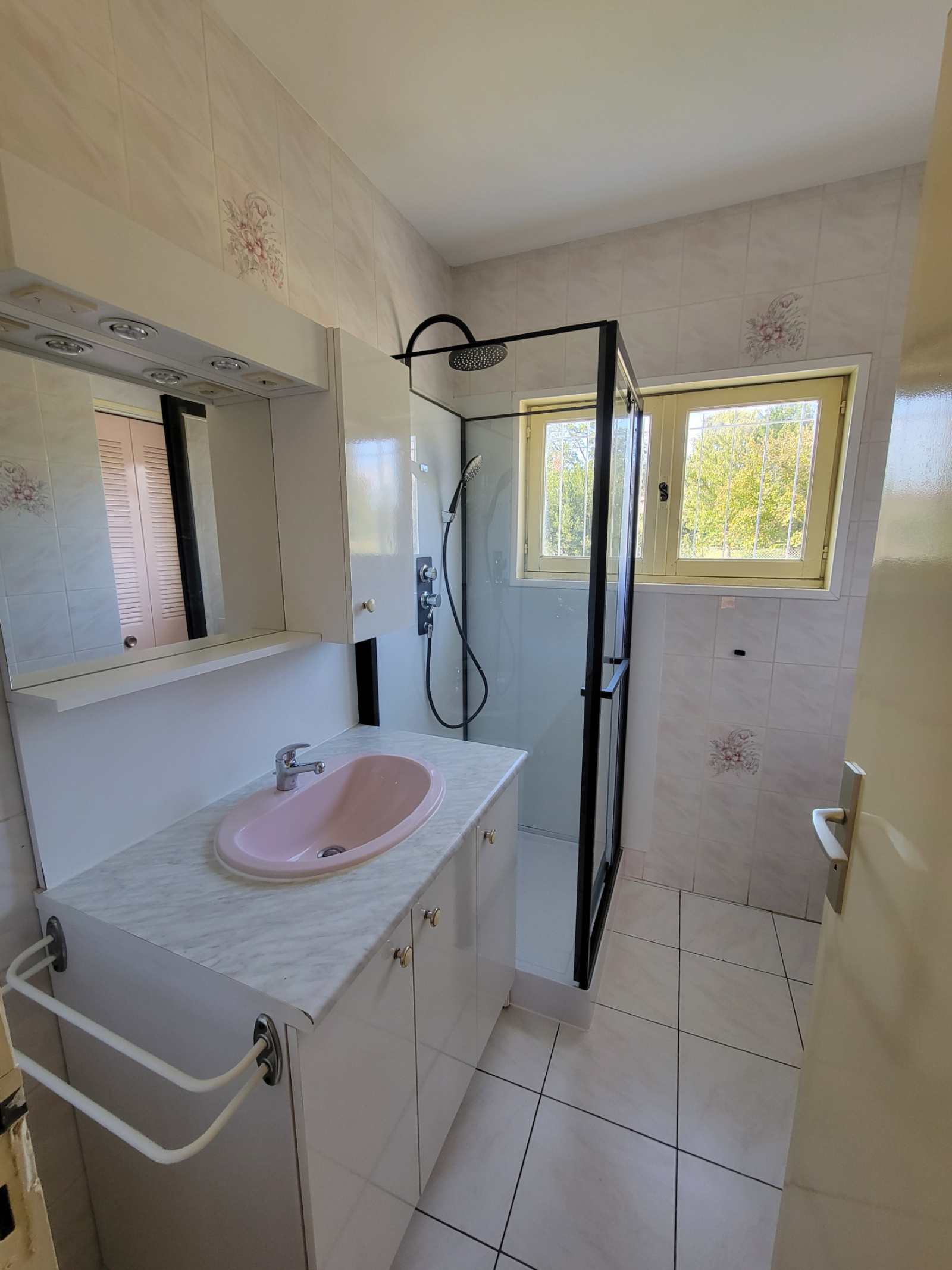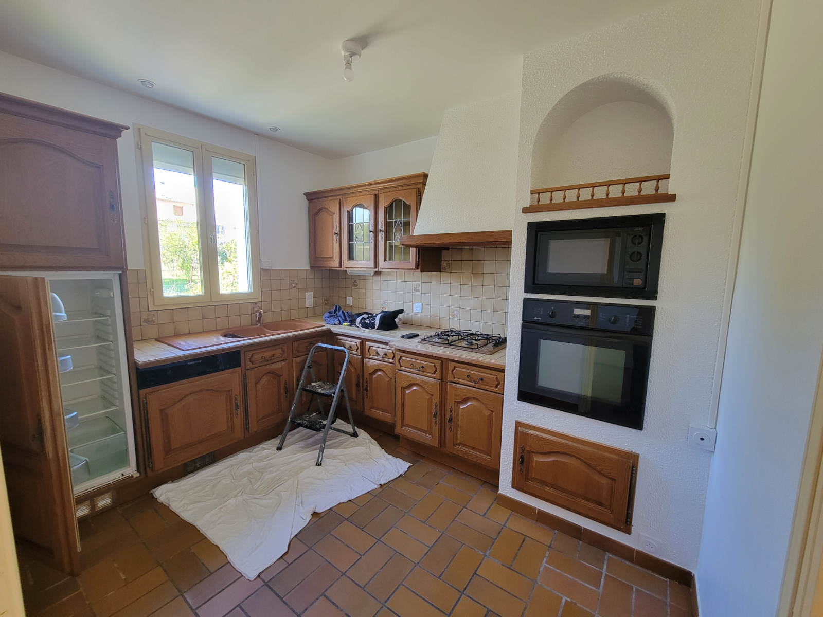 Maison fonctionnelle avec cuisine équipée, salon, salle à manger, 3 chambres, salle d'eau et WC séparés.