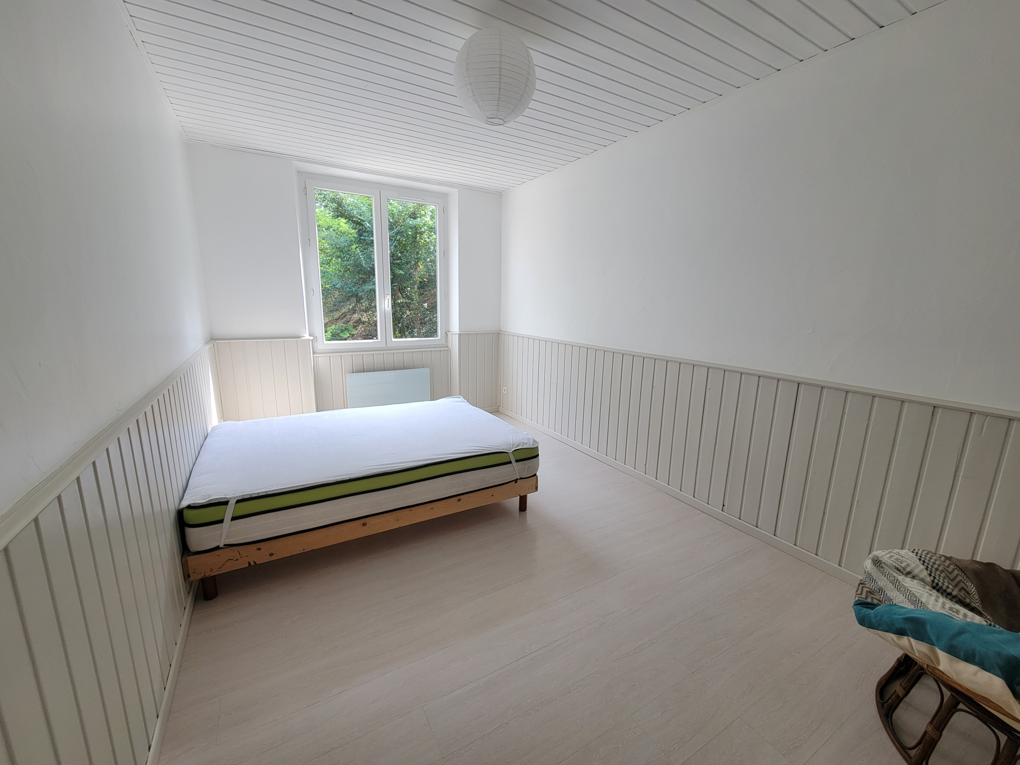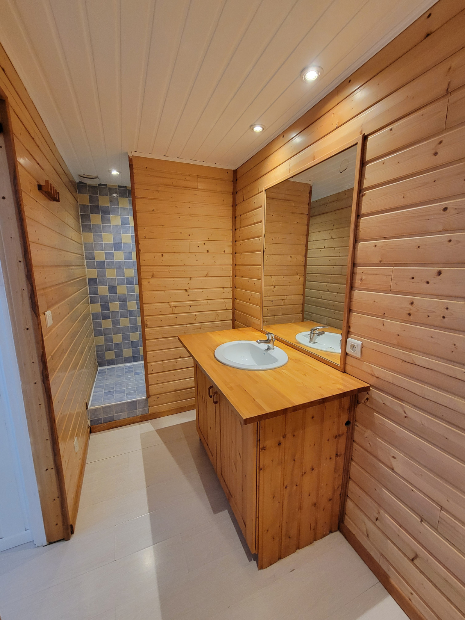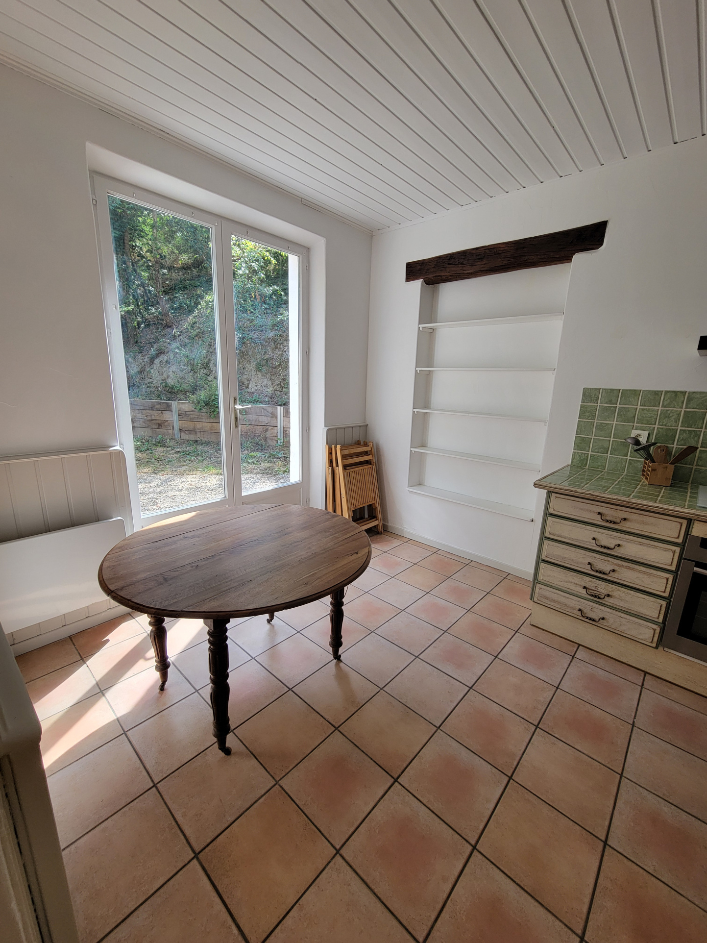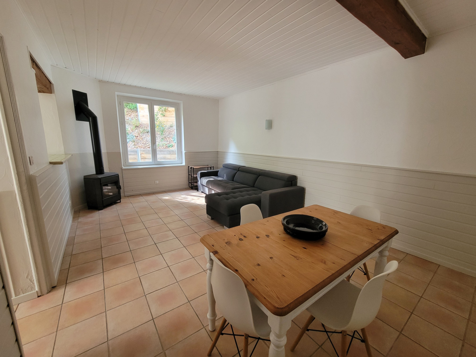Rdc séjour, avec poêle à bois, cuisine, salle d'eau.