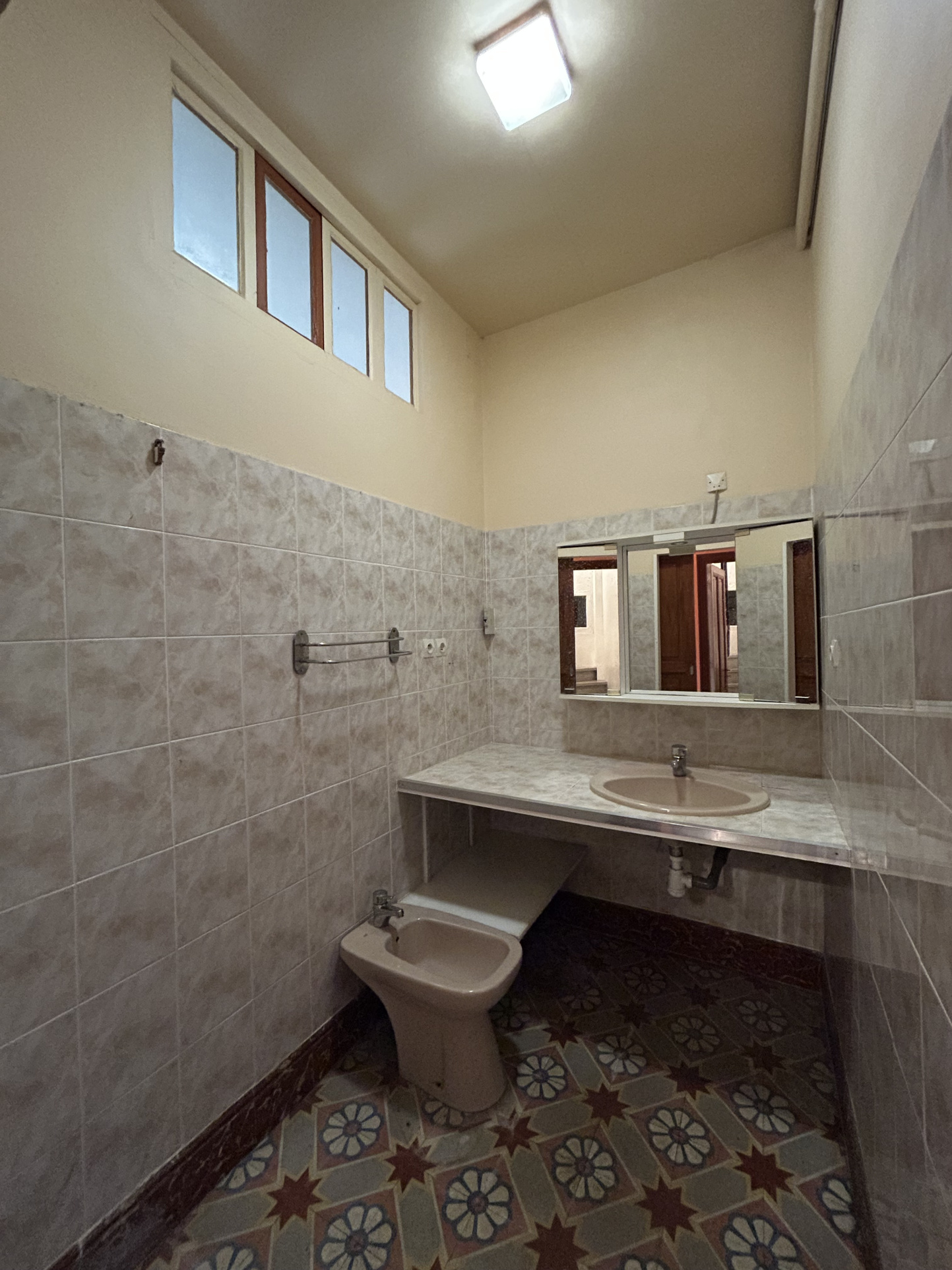 salle d'eauDouche Italienne, toilette, faïence et peinture anciennes, plafond dégraddé