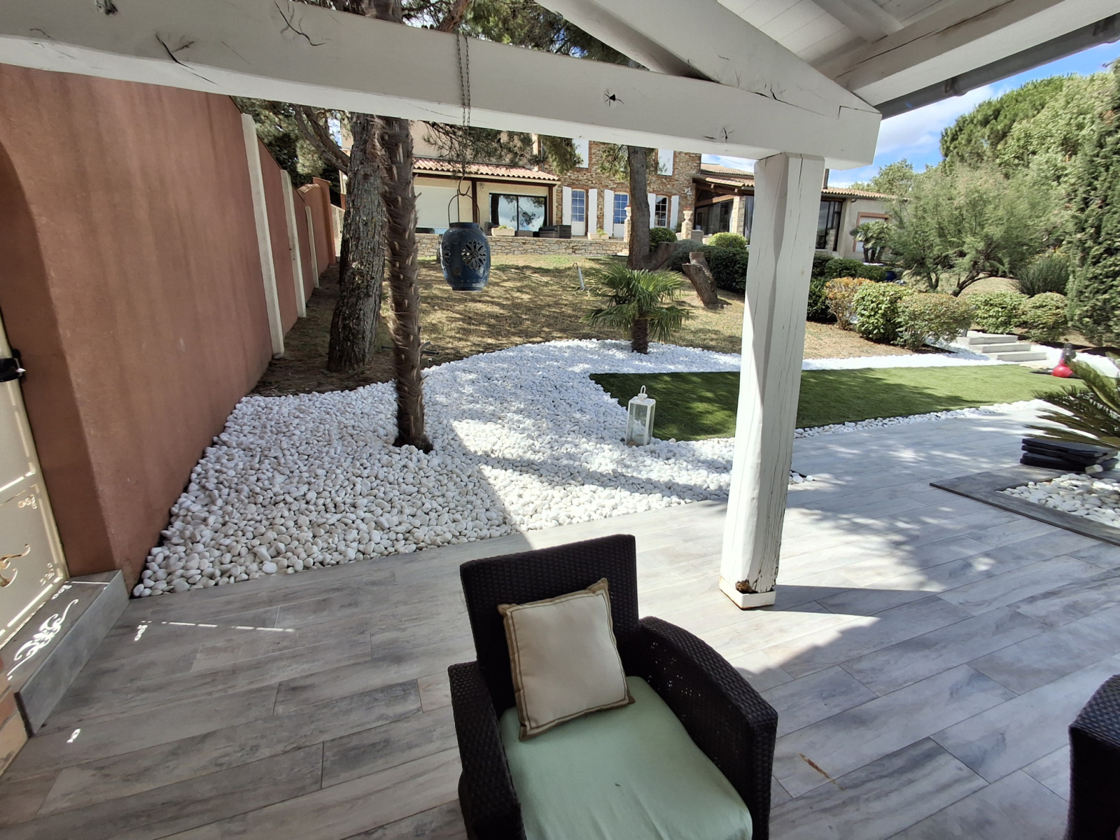 Véranda-Cuisine d\'étécharpente apparente, grand barbecue, bar, baie en alu, dalles de bavière grise au sol