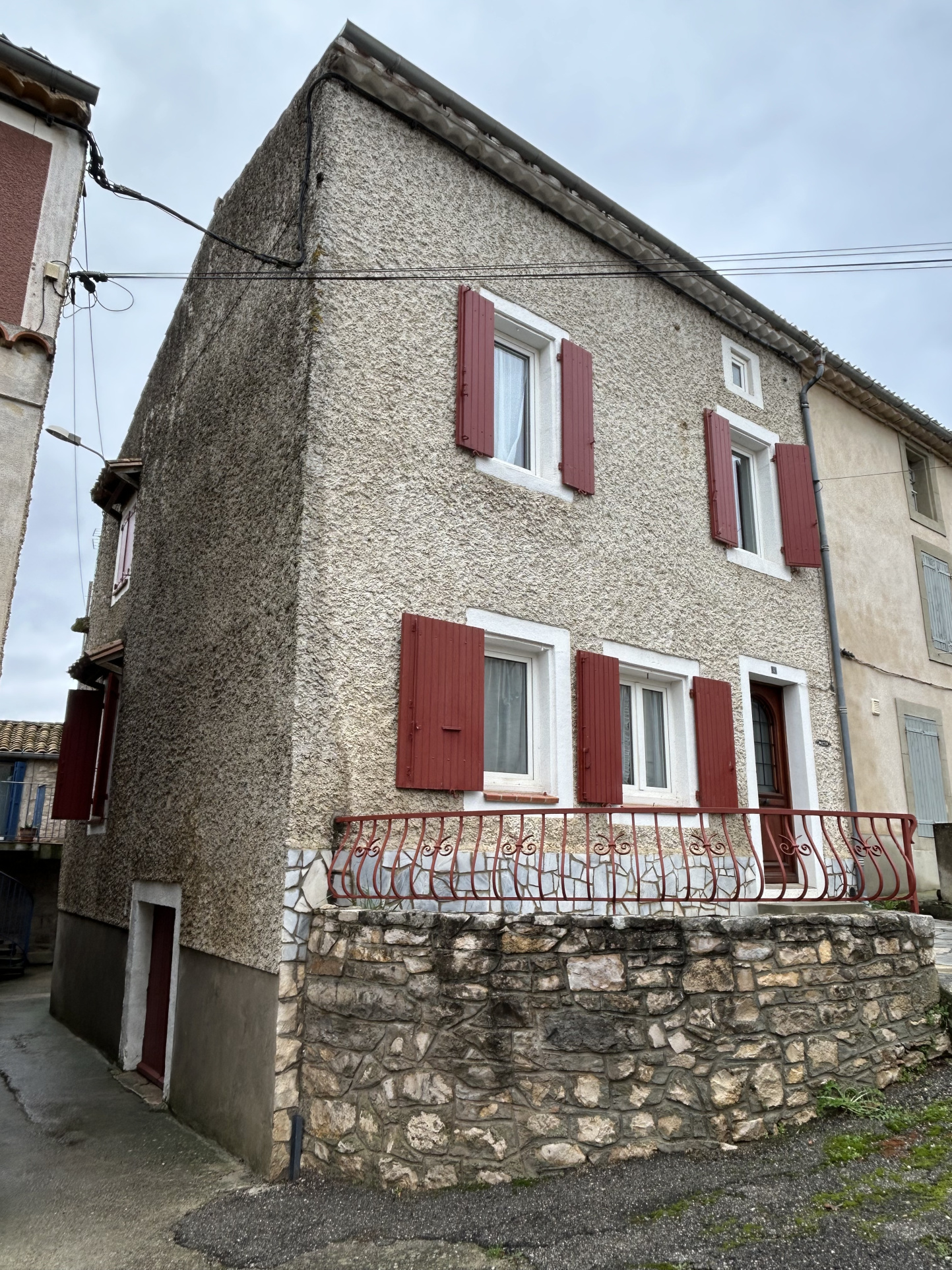 Au coeur d'un village du Cabardes avec commodités et écoles, maison de village exposée plein sud bien entretenue, comprenant cuisine équipée, salon, 3 chambres, 1 salle d'eau et 1 wc. 1 véritable cave à vin de 40 m2 avec possibilité de stockage, vélos.... Double vitrage, chauffage central électrique (chaudière quasi neuve).